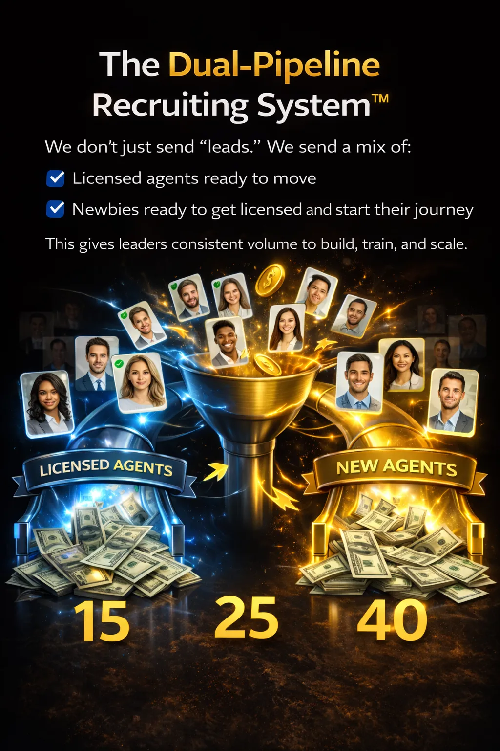 You receive a strategic mix of licensed agents and pre-licensed candidates. Licensed agents are ready to transition immediately. Pre-licensed candidates are motivated individuals ready to begin the licensing process. This dual-pipeline approach creates both short-term production and long-term depth.